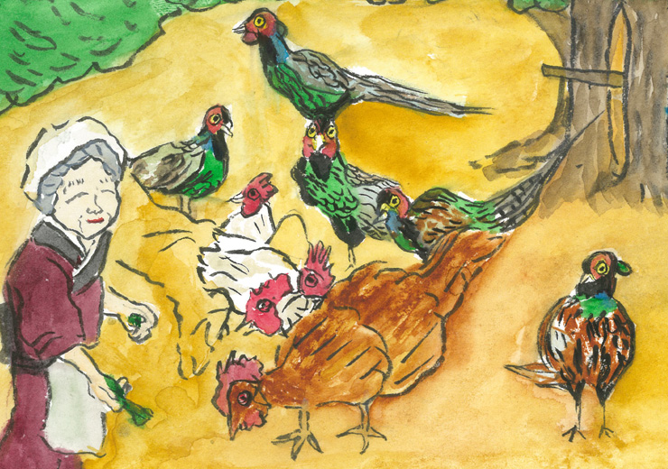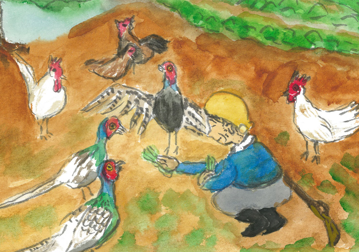じいさんは、かたわらの畑の菜っぱを抜いては、にわとりや雉子に食べさせてやりました。