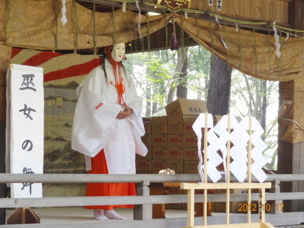 毎年10月17日に行われ、神事の後に神楽殿にて奉演されます。巫女、猿田彦、大蛇退治、天岩戸など古代神話をもとに十二の舞曲から成り立つ荘厳な歌舞で氏子を中心に大切に継承されています。